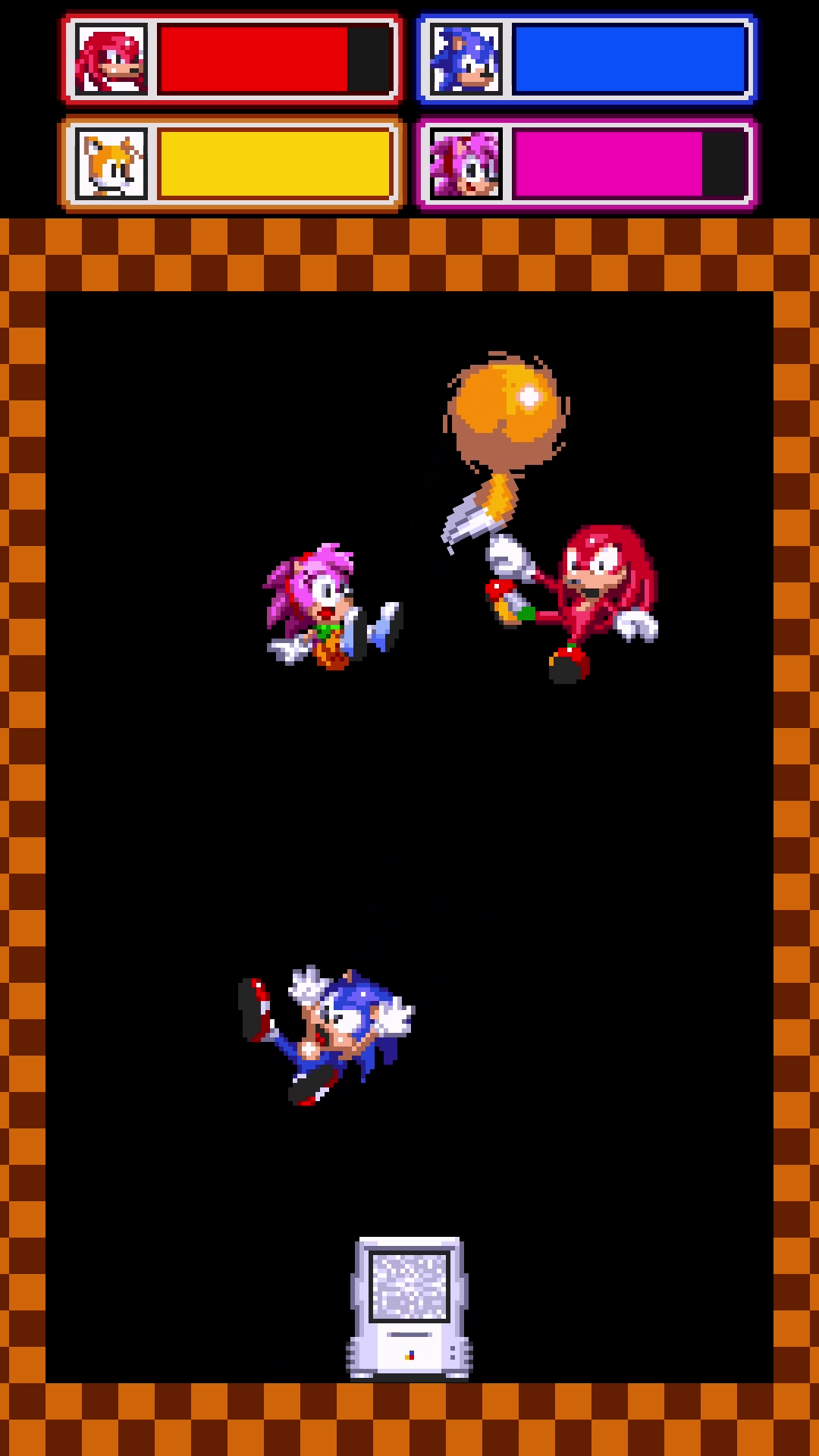 A Sonic fan game based on popular simulation games on YouTube/TikTok where characters bounce around between four walls, collecting power-ups and using their own abilities.